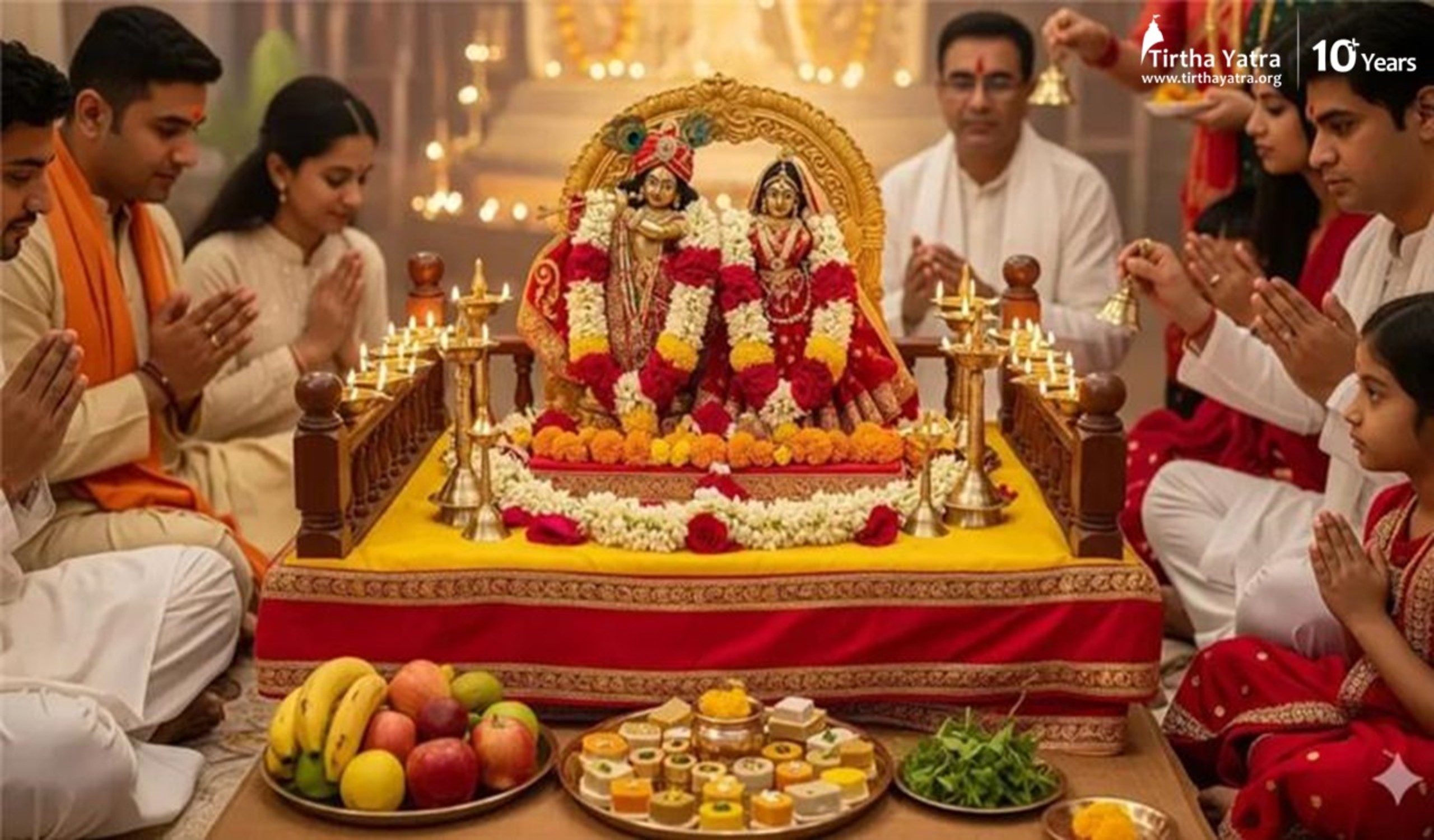 Abhishekam with Panchamrit, Chappan Bhog offerings, and Radha Gayatri mantra chanting.