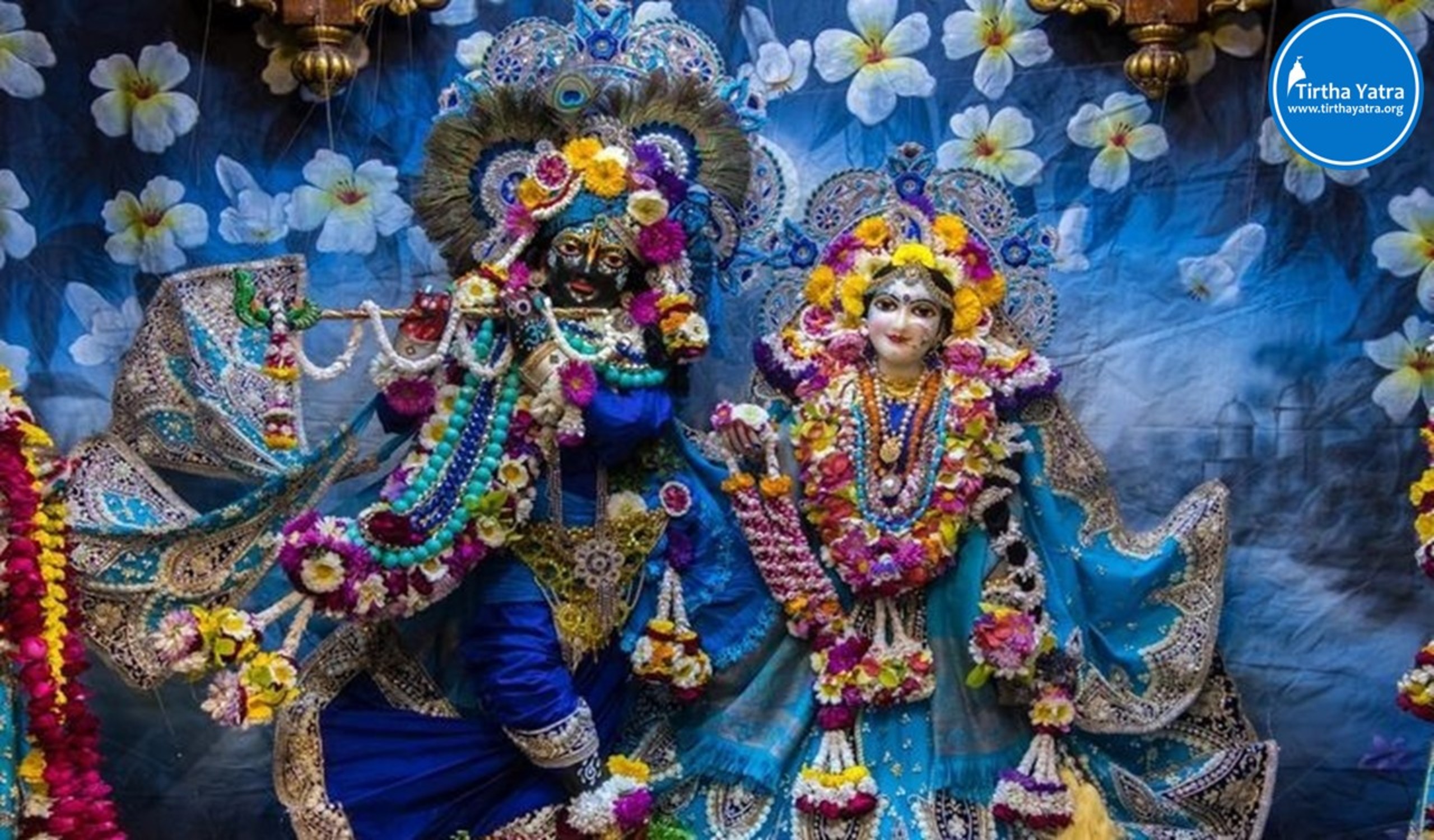 Dress the Deities of Srimati Radha Rani and Lord Sri Krishna in grand, beautiful yellow or blue attire, adorned with jewelry. Blue (Neelambhari) is considered Radha Rani’s favorite color.