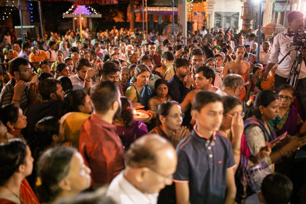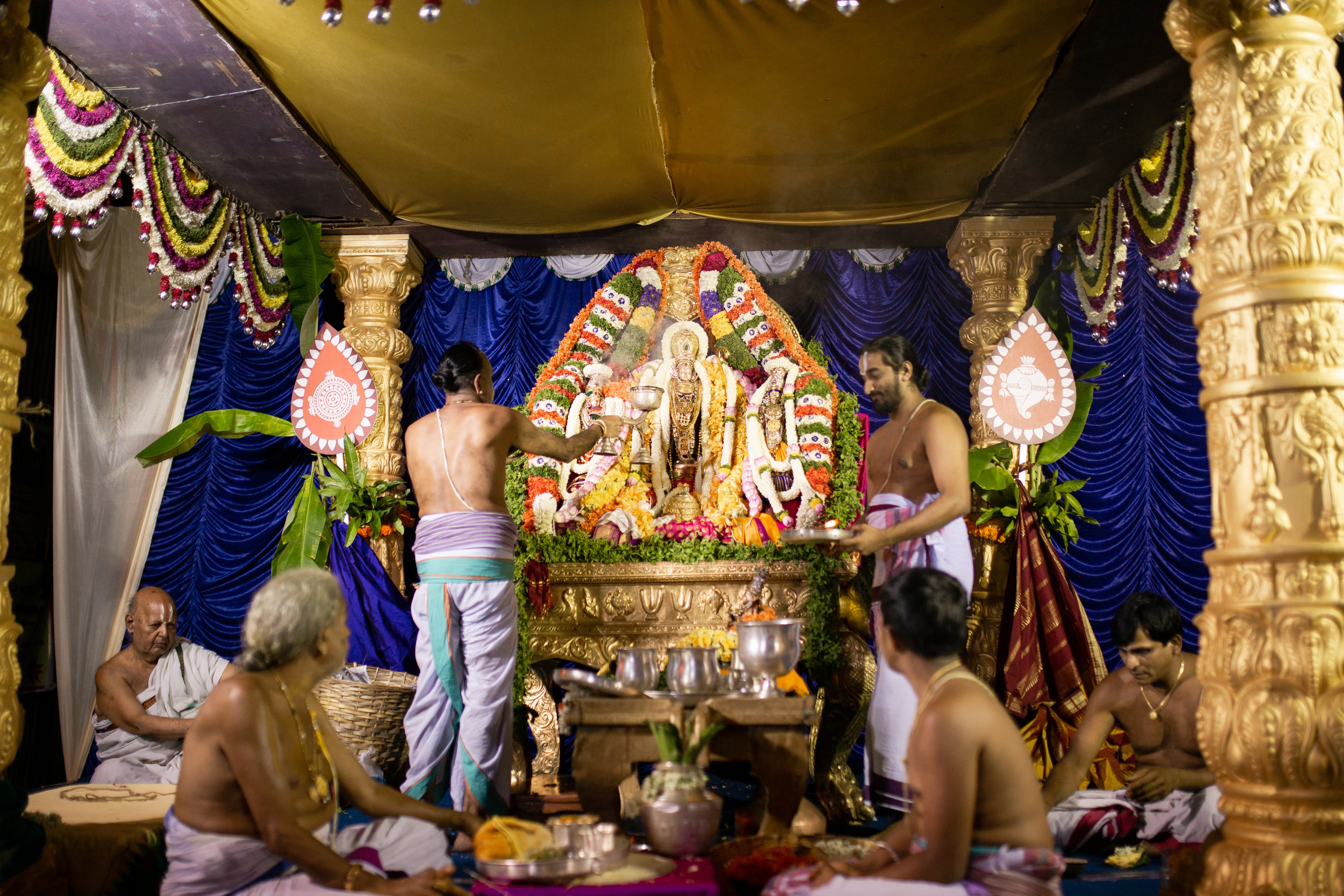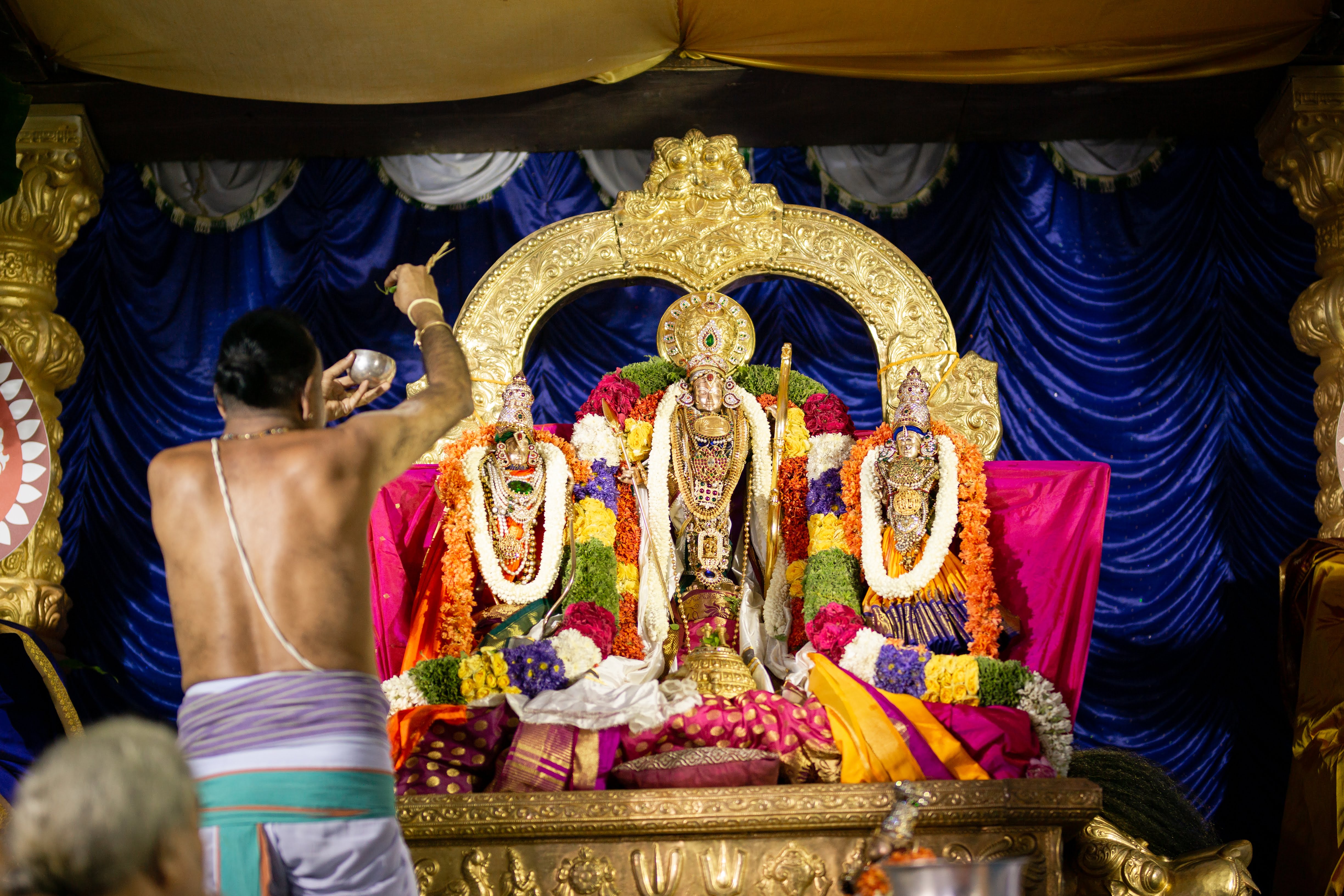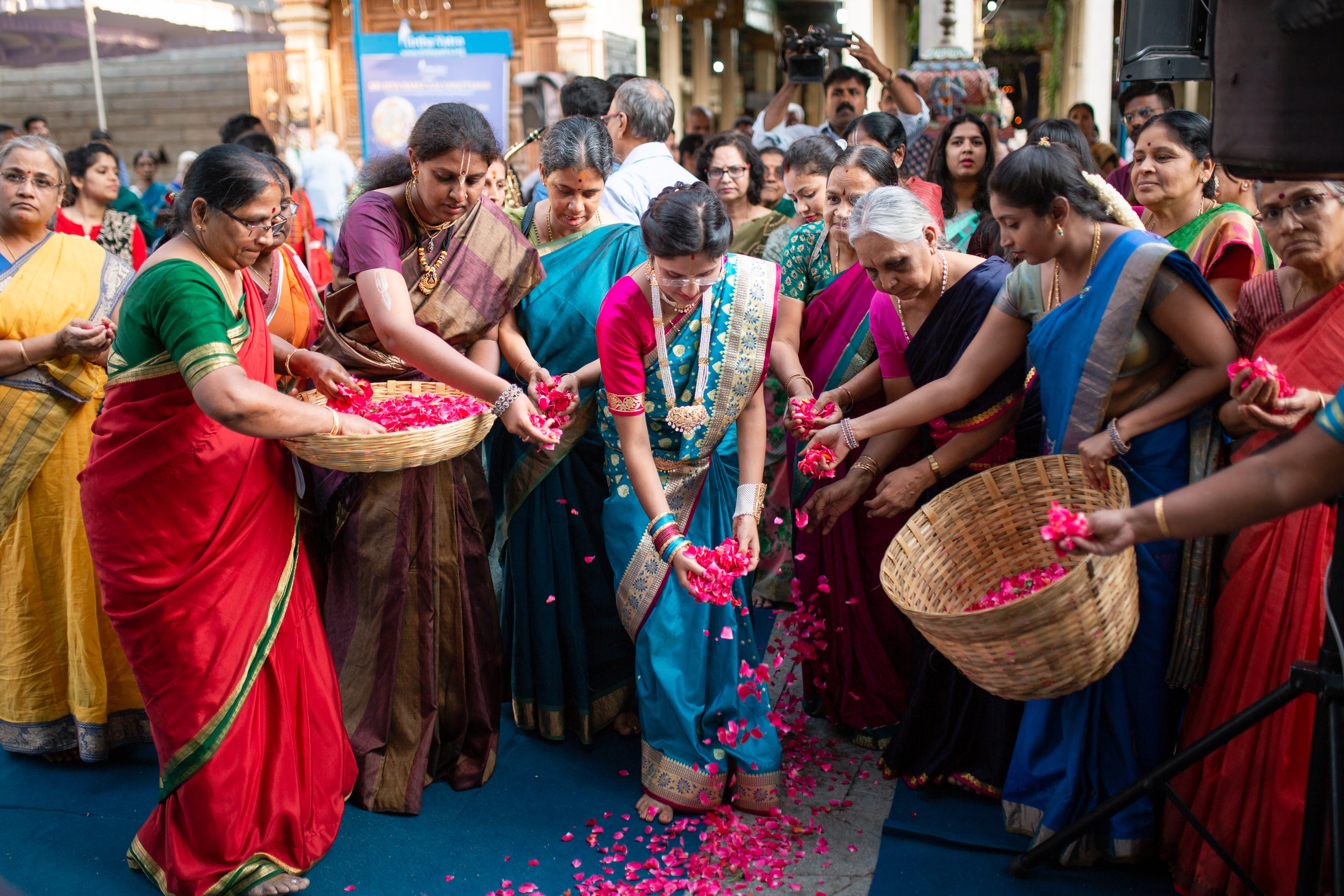 Devotees showering flower petals to welcome Their Lordships for the grand Kalyanotsava after the Pallaki Utsava
