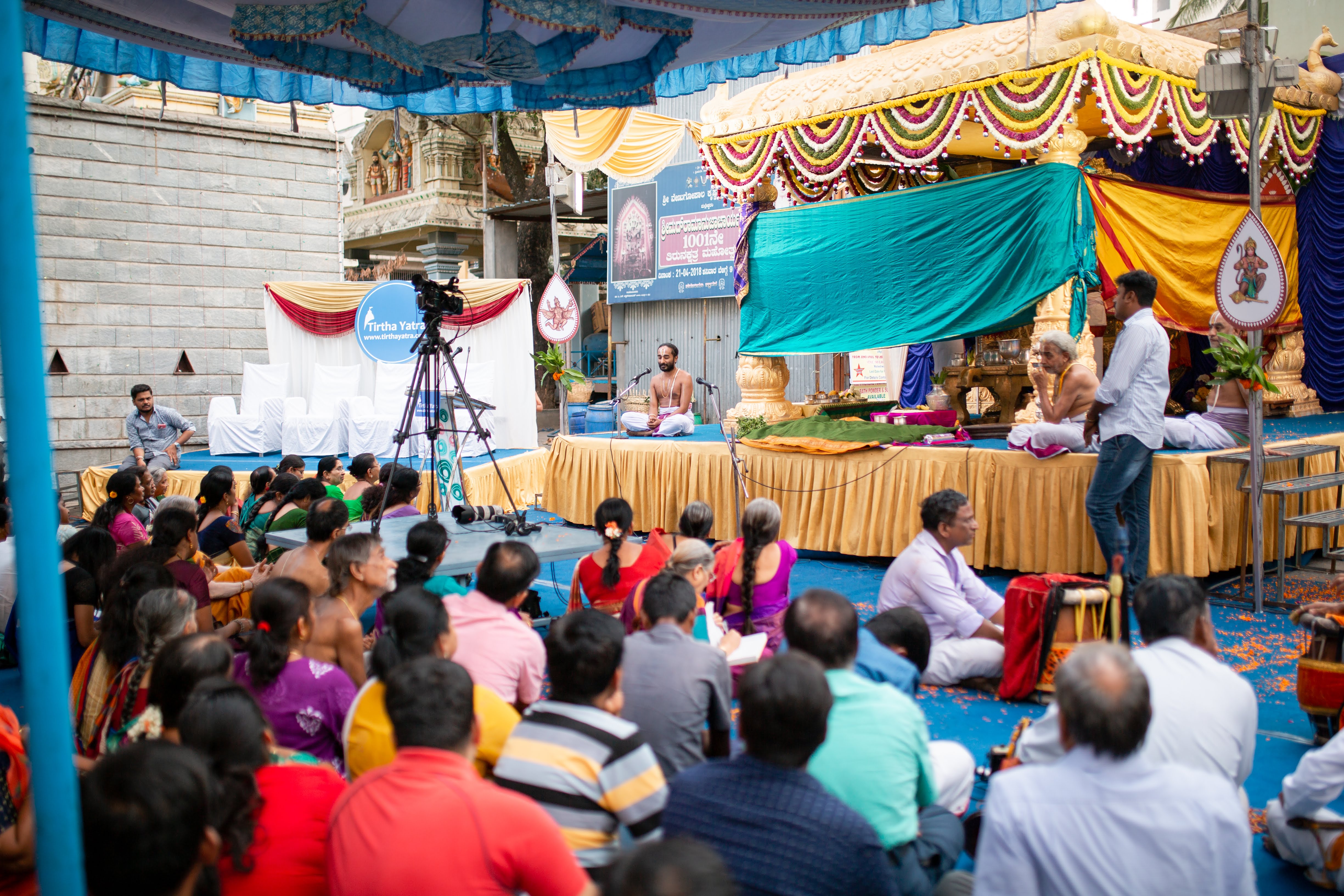 Bharat Bhattar narrating a spiritual discourse while the preparations are being carried out for the Kalyanotsava